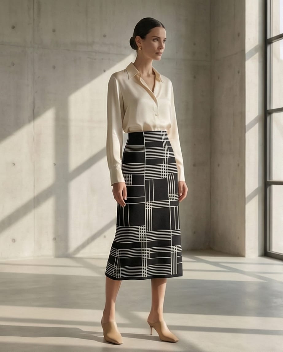 SAIA MIDI JACQUARD EM TRICÔ,  XADREZ IRREGULARES